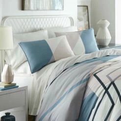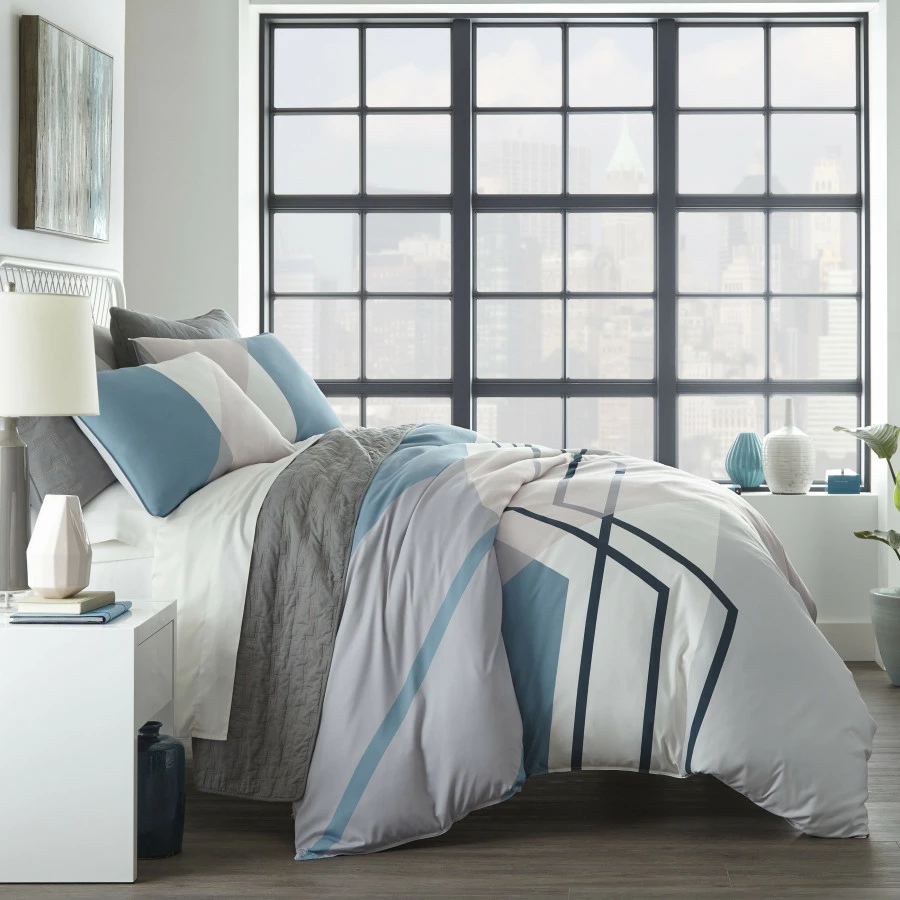 Bring Modern Sophistication To Your Bedroom Decor With The City Scene Thornton Duvet Cover Set. Intersecting Lines Of Pastel Blue And Pink On A Crisp White Ground, Add A Modern Touch To This Digitally Printed Ensemble. Constructed With Soft And Silky Microfiber, The Thornton Duvet Cover Reverses To Solid Baby Blue That Contrasts The Abstract Face. Artistic And Urbane, This Bed Set Will Provide A Fresh Update With A Contemporary Attitude For Any Bedroom. Coordinating Shams Mimic The Face Of The Duvet Cover And Feature A European Closure. Duvet Cover Features A Zipper Closure With Additional Inner Corner Ties And Is Machine Washable For Easy Care. Duvet Insert Sold Separately.