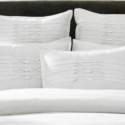Sophisticated solid bedding at its finest. The Triple Diamond white duvet collection by City Scene bedding is beautiful in its simplicity. Solid white throughout the duvet with a triple pleated section with diamond folds at the foot of the bed. Both the standard and king sham along with the available euro sham have a matching pleat design. Made from soft microfiber polyester for a wrinkle resistant and comfortable set.