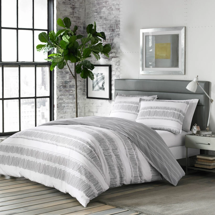Dots And Dashes Make An Artful Statement In This Urbane Stripe Pattern In Cool Gray On Crisp White Cotton. The Casual, Hand Drawn Imperfection Of The Lines And Dots Appear As If They Come Straight From An Artist Sketchbook. The Gray On White Comforter Face And Shams Feature Rows Of Sketch Marks Tamed Into Horizontal Bands. This Main Design Reverses To A Complementary Dotted Stripe In White On Gray, Offering An Alternate Pattern Option To Try. Add Additional Comfort And Textural Interest By Layering In Our White Maze Quilt And Shams Or Our Triple Diamond Quilted And Pleated Accent Pillows.