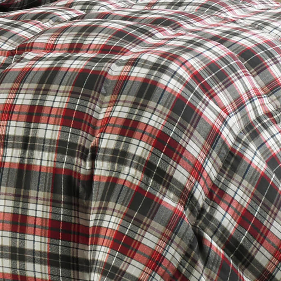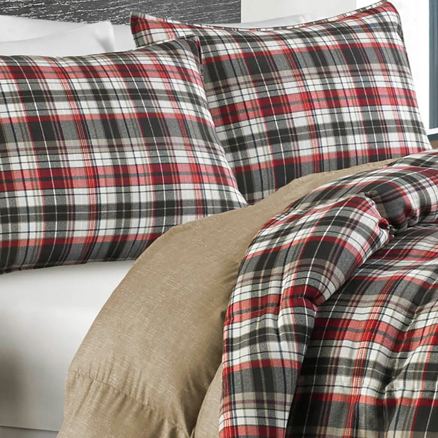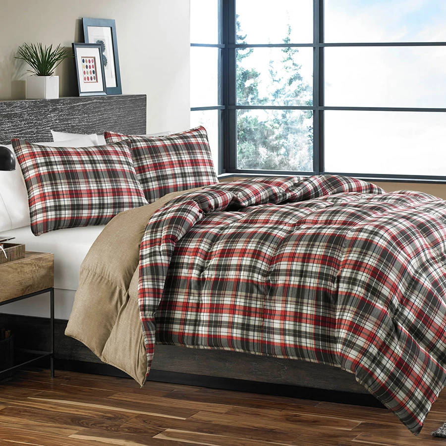 Eddie Bauer Astoria comforter set combines great style with performance. The comforter face features a red and black plaid design with a large box stitch. The face uses a polyester micro suede material while the reverse uses a soft finish microfiber and is solid tan. Generous fill will keep you warm on cold nights. Wrap up in a new comfortable Eddie Bauer comforter set today! Machine washable.