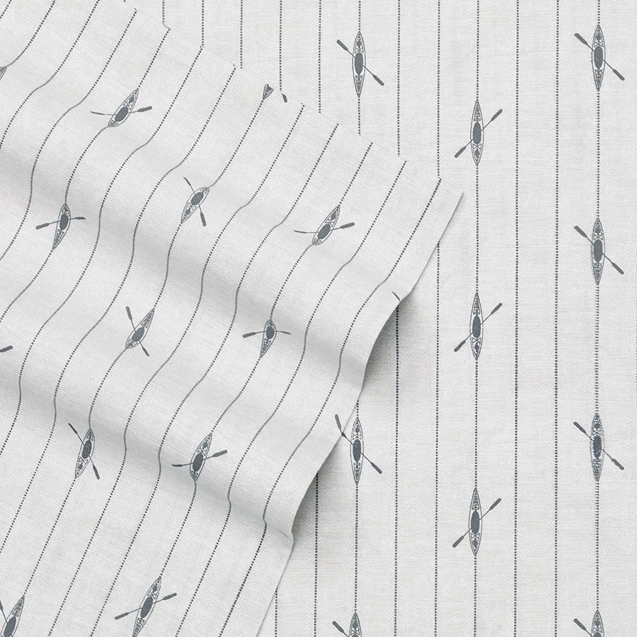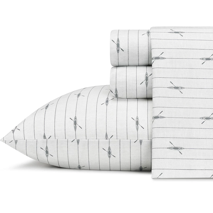 Eddie Bauer Downstream sheet set offers durability and comfort. The sheet set has printed kyak and stripe design in grey on an ivory background. Sheets are 100% percale cotton with a 200 thread count for superior softness. Combine with a new Eddie Bauer bedding set or with your existing bedding. Let the comfort of the percale cotton ease you into a restful night’s sleep.