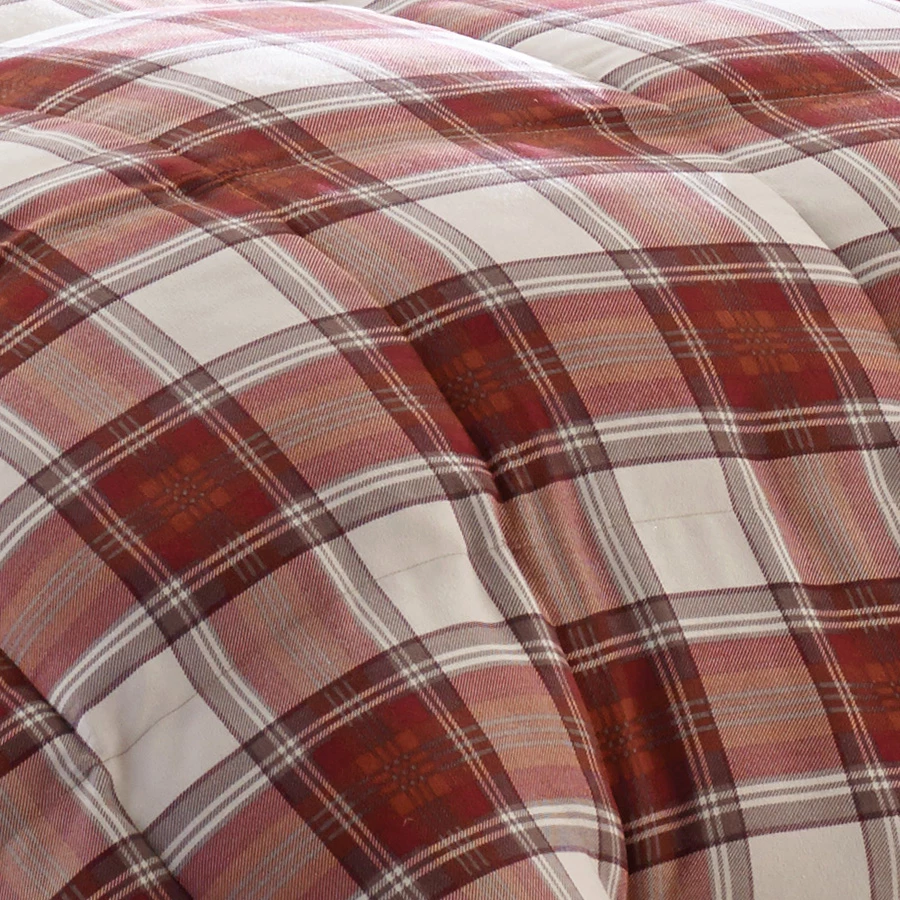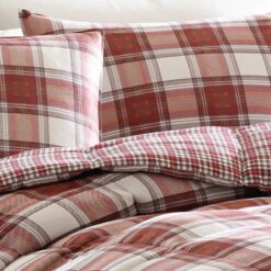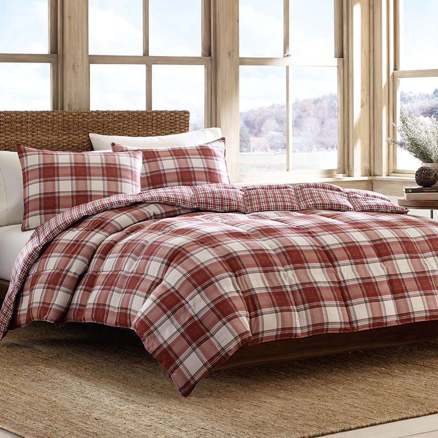 Eddie Bauer Edgewood Plaid comforter set combines rugged style with performance. The comforter face features a red plaid design with a large box stitch. The face has a polyester micro suede material while the reverse uses a soft finish microfiber. Reverse print features a small plaid design. Generous fill will keep you warm on cold nights. Sleep great in a new Eddie Bauer comforter set!