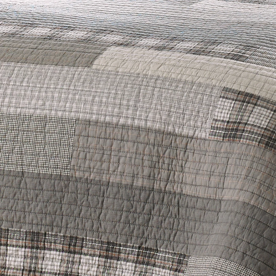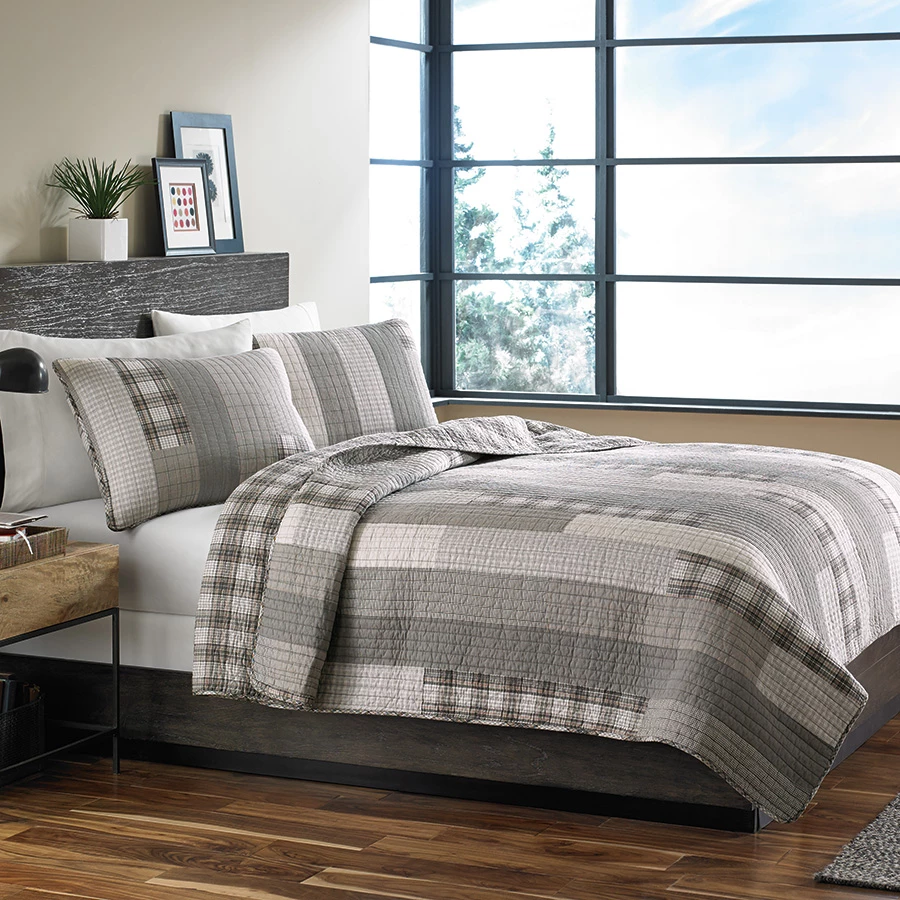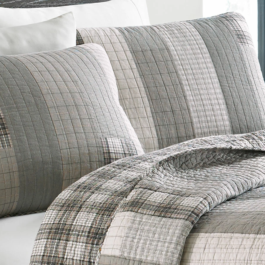 Eddie Bauer Fairview quilt set features a gray stripe design. Gray and ivory colors combine beautifully in this new Eddie Bauer quilt set. Two quilted shams matching the quilt are included with the set. Quilt features a plaid bound edge and plaid reverse. Update your bedroom with a new quilt set from Eddie Bauer. All pieces are 100% cotton including the fill.