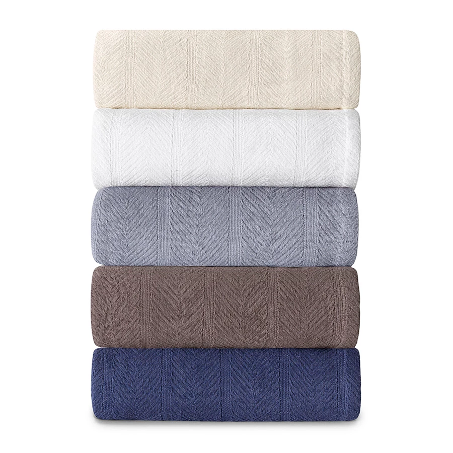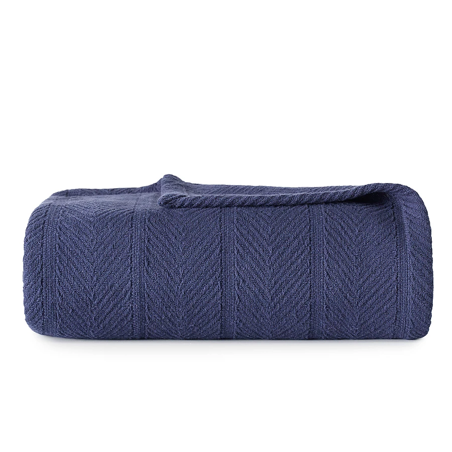Eddie Bauer Cotton Herringbone Navy blanket are perfect to layer onto your bed or to snuggle up on the couch. A herringbone stripe weave makes this all cotton solid color blanket something special. The handsome tonal texture adds subtle style and the rich Navy color makes a strong statement whether used alone or as a lightweight layering piece on your bed. 100% solid cotton blanket with a open end cotton weave in a north-south herringbone design. Blankets have a nice weight with a 325 gsm. Choose the color best suited to your style. Machine washable.