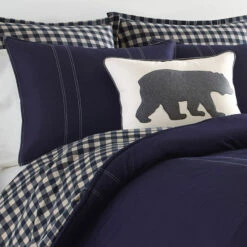 Eddie Bauer Kingston comforter set features a new look. Top of bed is solid navy with a three piece face and two pleats design from north to south. Comforter and sham reverse features a navy and ivory plaid print on pre-shrunk flannel. 100% cotton materials are both soft and durable. Bring a new look to your bedroom with a new Eddie Bauer comforter set. Generous fill will keep you warm on cold nights. Machine washable.