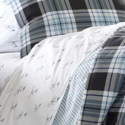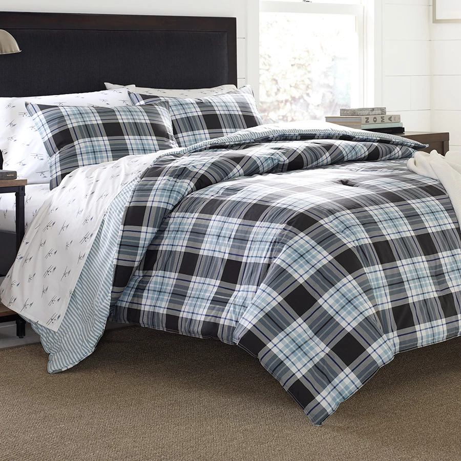 Eddie Bauer Lewis Plaid comforter and duvet set sports an inviting black and dark smoke on pale ivory with a sea blue accent. The large plaid face is complimented nicely by a crisp shirting stripe reverse. 100% soft cotton materials are sure to ease you into a restful night of sleep. Just add a new Eddie Bauer sheet set or one of your own to complete a whole new look in your bedroom. Machine washable.