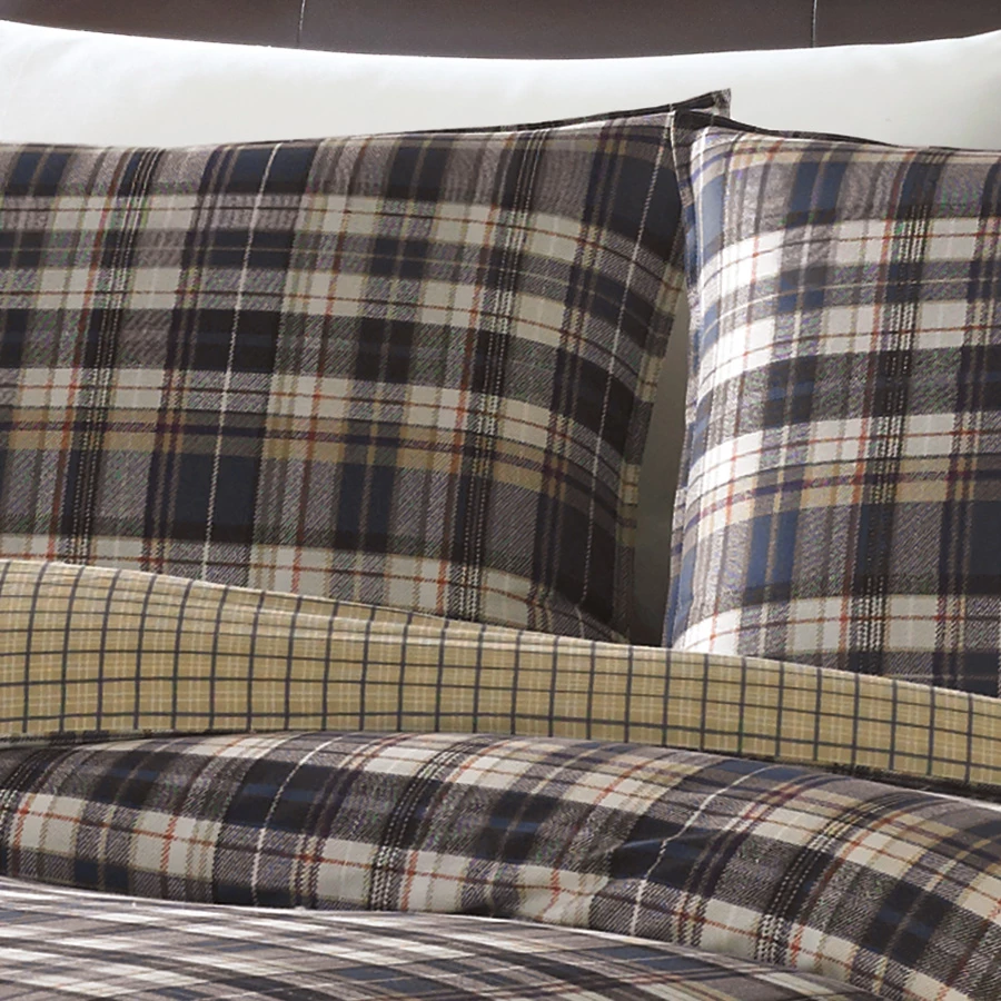 Eddie Bauer Port Gamble comforter and duvet set sports an inviting khaki and blue plaid print. The large plaid face is complimented nicely by a smaller plaid reverse. 100% soft cotton materials are sure to ease you into a restful night of sleep. Just add a new Eddie Bauer sheet set or one of your own to complete a whole new look in your bedroom.