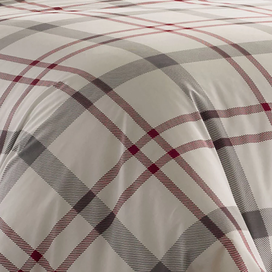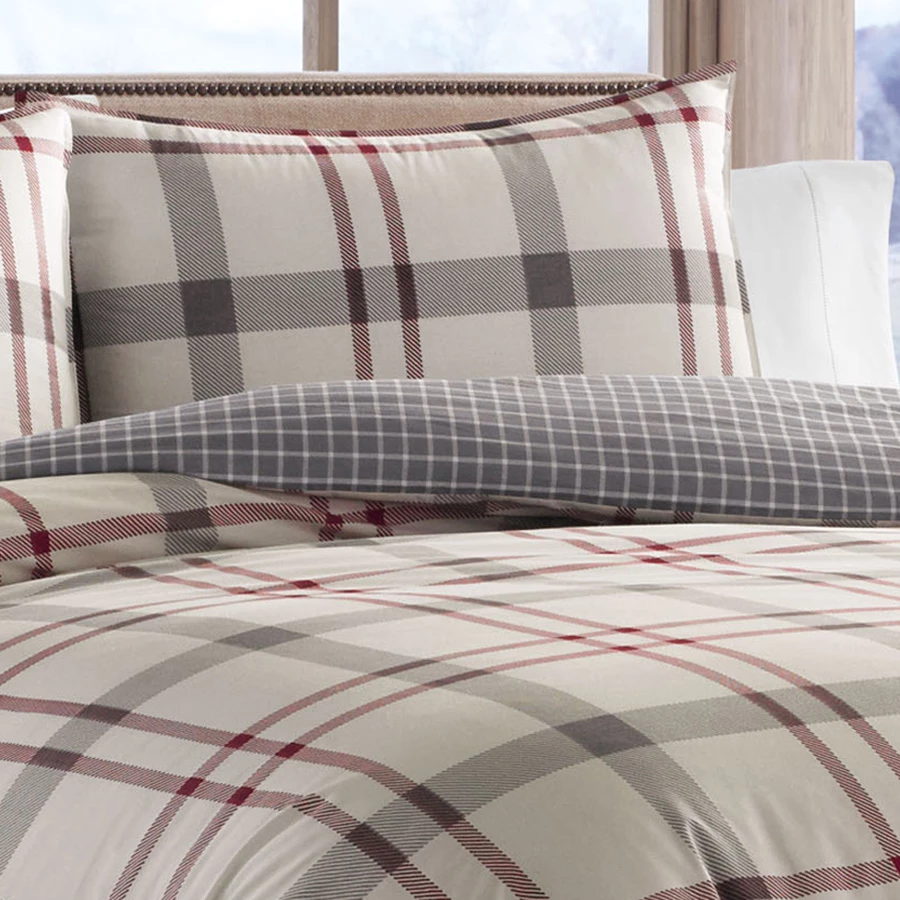 Eddie Bauer Portage Bay comforter and duvet set sports an inviting grey and red plaid print on an ivory ground. The large plaid face is complimented nicely by a smaller grid reverse with a dark grey ground. 100% soft cotton materials are sure to ease you into a restful night of sleep. Just add a new Eddie Bauer sheet set or one of your own to complete a whole new look in your bedroom. Machine washable.