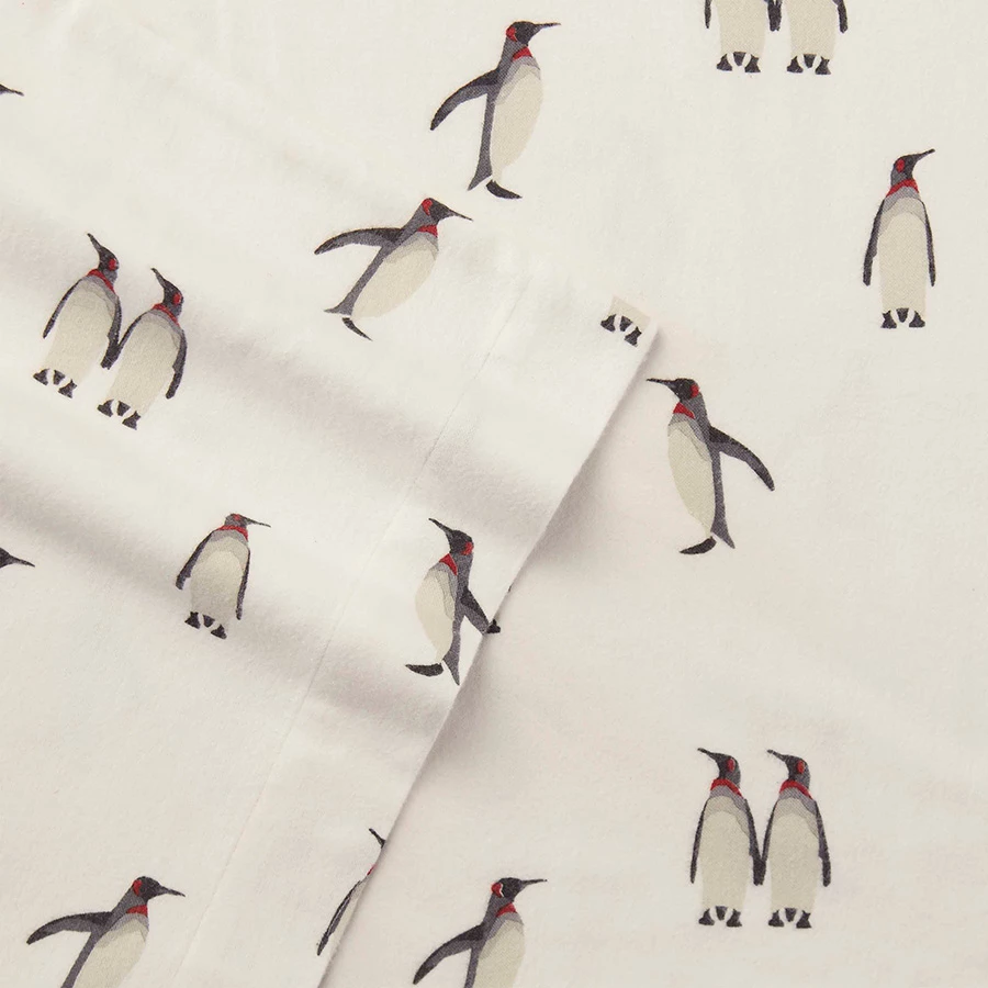 Eddie Bauer Rookeries flannel sheet set offers warmth and comfort. Sheet set features playful penguins in tones of gray with bright red accents pose and preen across a snowy white background. Sheets are 100% brushed cotton flannel and just the right thickness. Combine with a new Eddie Bauer bedding set or with your existing bedding. Let the comfort of the cotton flannel ease you into a restful night’s sleep. Machine washable.