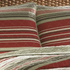 Eddie Bauer Yakima Valley Red quilt set features a fresh take on stripe design. Red stripes are complimented with pops of brown and khaki accents. Soft cotton materials are used throughout to provide a soft and comfortable sleeping surface. Chevron reverse compliments the overall design. Coordinating shams match the color and design of the quilt. Get a good night sleep with a new Eddie Bauer quilt set. Machine washable.