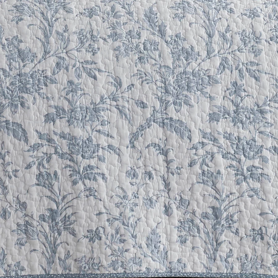 The Amberley Soft Blue quilt set by Laura Ashley offers a clean two-tone floral design. This delicately rendered floral toile is classic and fresh in blue on white and offers timeless elegance for your bedroom. Two quilted shams matching the quilt are included with the set. The quilt reverses to a mini print vine coordinate on a blue background that also trims the edges for a neatly tailored finish. Pre-washed for extra softness and comfort, this quilt set will create a relaxed and inviting update for your bedroom. All pieces are 100% cotton including the fill. Machine washable.