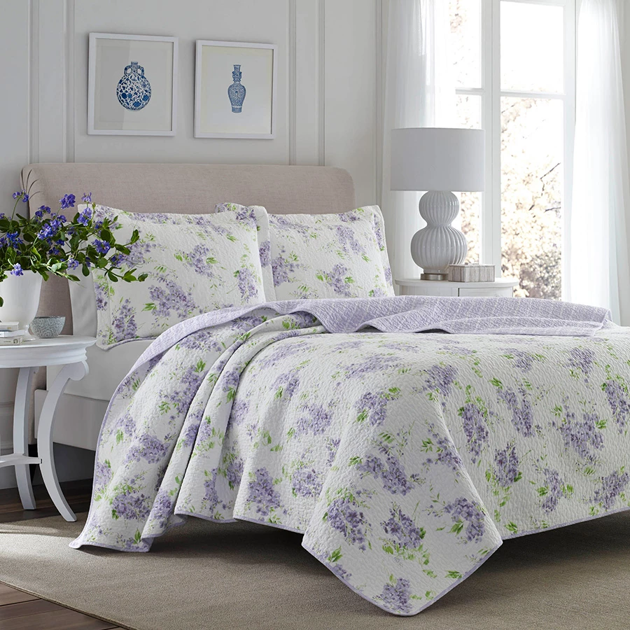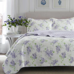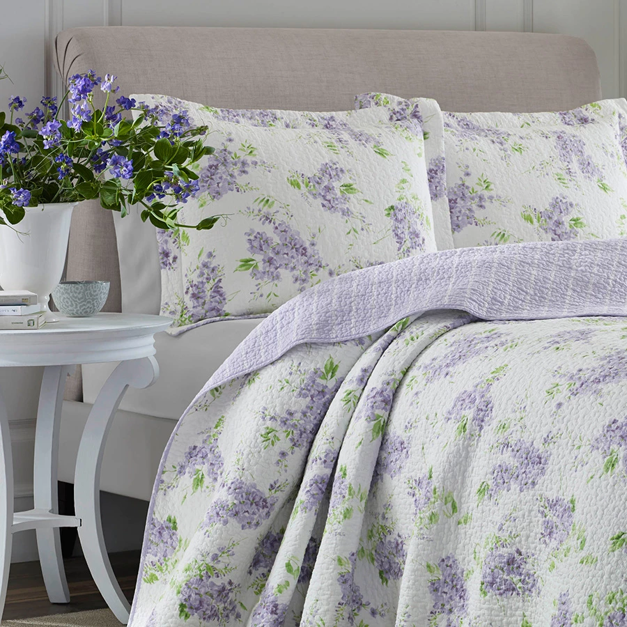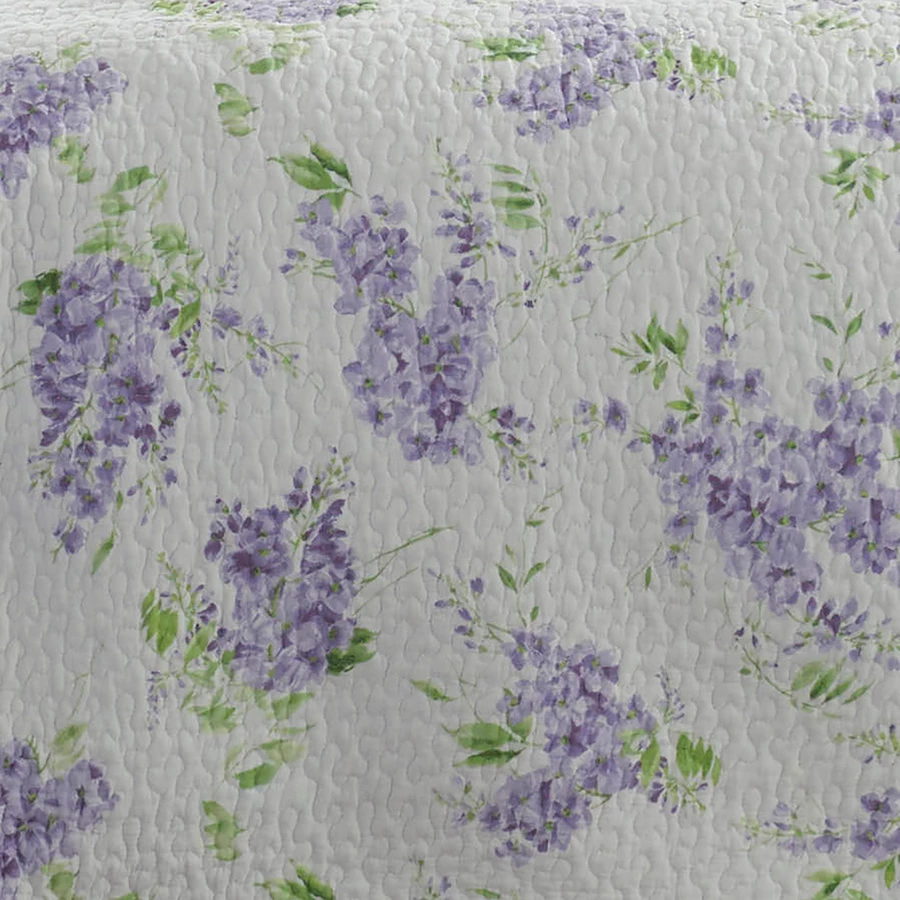 Keighley is a new addition to the Laura Ashley quilt line. Wisteria blossoms cascade across a pristine white background in this delightful quilt set that will bring a touch of springtime to your bedroom. Quilt reverses to a pale lilac mixed with accented by the white vine stripe print. 100% cotton materials including the fill. Take your bedroom style in a new direction with a quilt set from Laura Ashley. Machine washable.