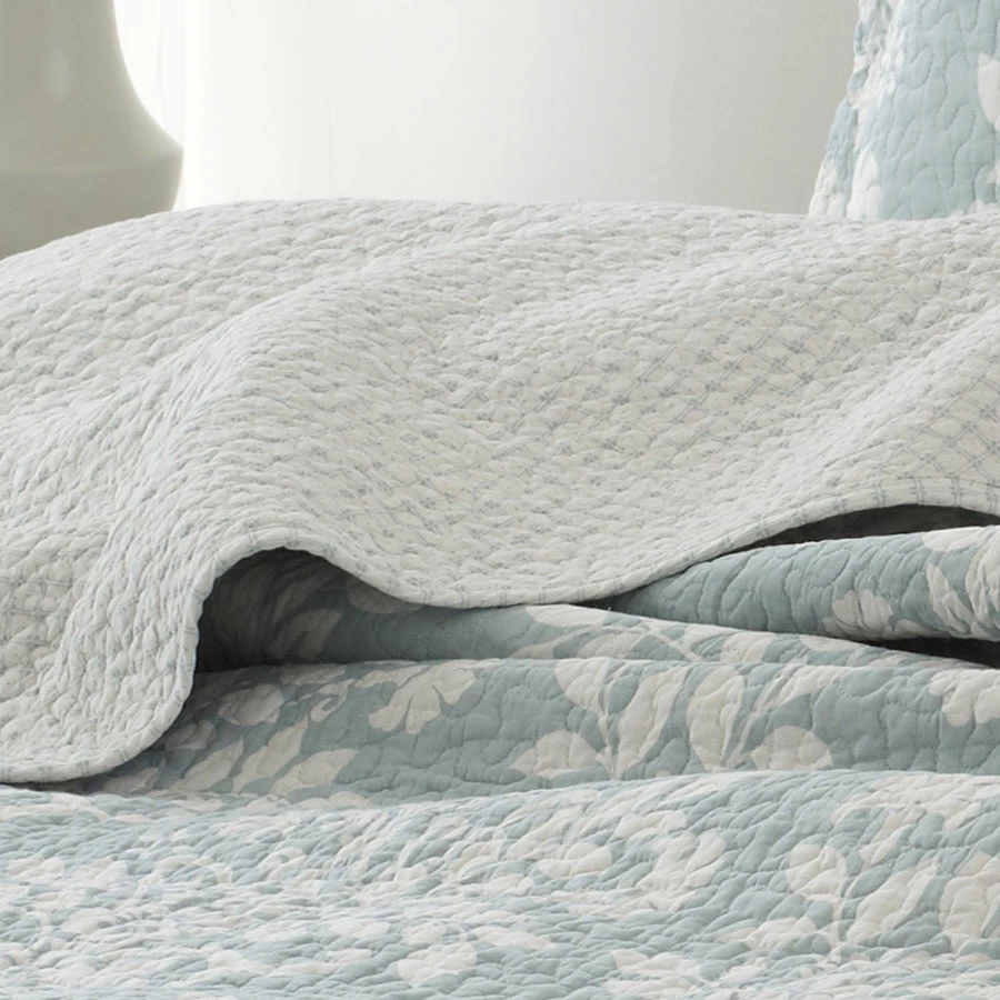Striking beauty. The Rowland Blue Quilt set by Laura Ashley combines the splendor of damask with the timeless quality of quilting to create high style. The white floral damask runs in close vertical rows up a blue background. The print on the reverse offers a change of pace with a small geometric design. It’s perfect as an addition to existing bedding or on its own. With this 100% cotton quilt in your bedding ensemble, you’ll add not only warmth and comfort, but also a touch of class.