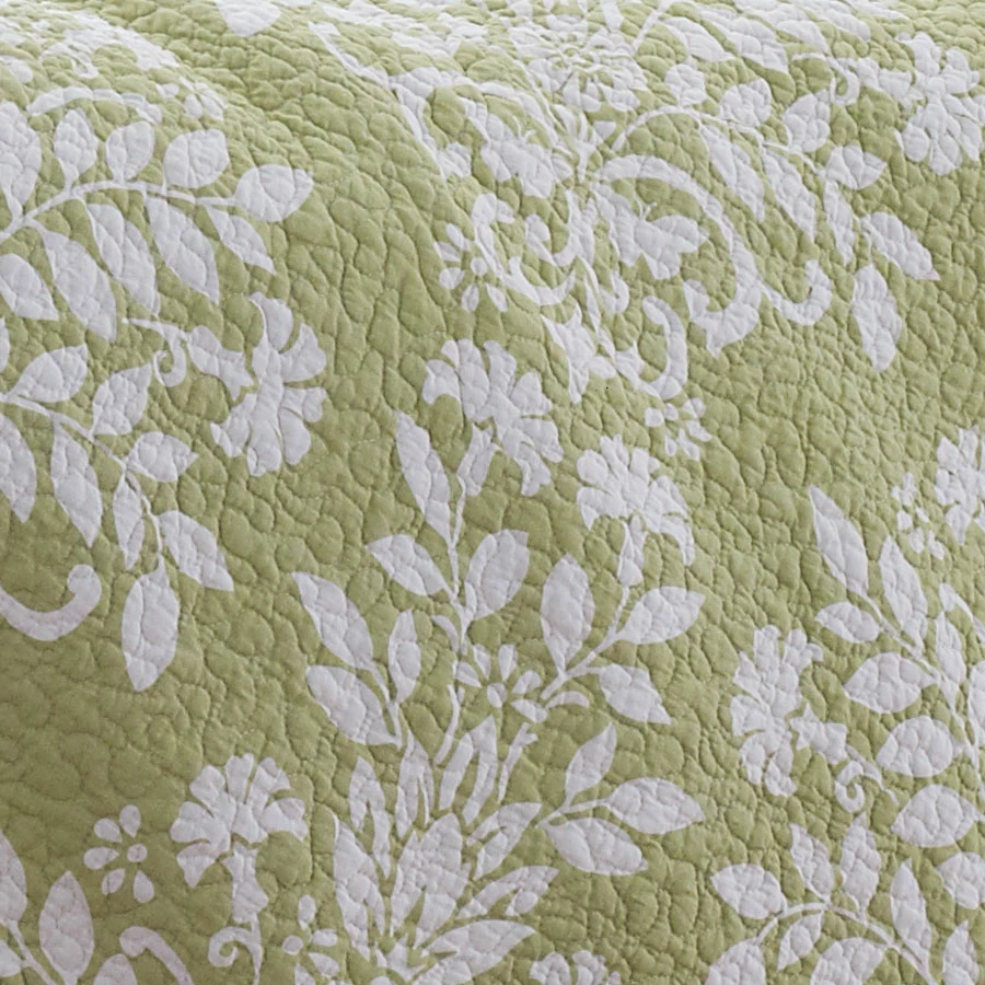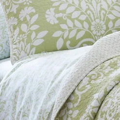 Striking beauty. The Rowland Quilt by Laura Ashley combines the splendor of damask with the timeless quality of quilting to create high style. The white floral damask runs in close vertical rows up a sage green background, paired with a geometric design on the reverse side. It’s perfect as an addition to existing bedding or on its own. With this 100% cotton quilt in your bedding ensemble, you’ll add not only warmth, but also a touch of class.