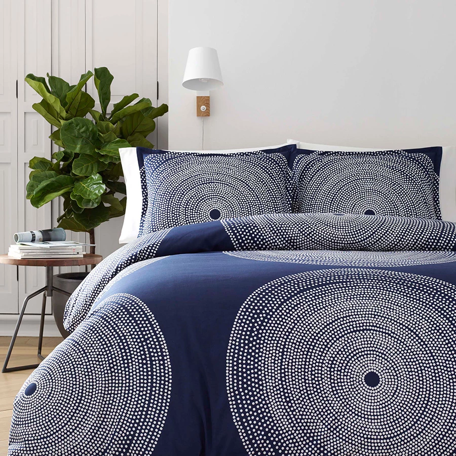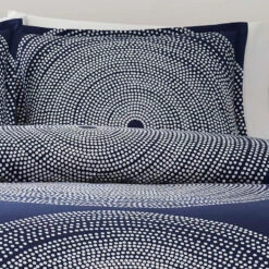 Marimekko Fokus comforter and duvet set features a modern design. The navy top of bed and shams give way to large ivory circle motifs. A coordinating sheet set is available and sports a matching print with an ivory ground and navy circles. Bedding and shams have a 200 thread count for superior softness. Bring a new style into your bedroom with a new bedding set from Marimekko. Machine washable.