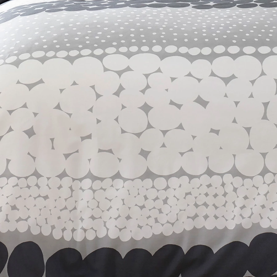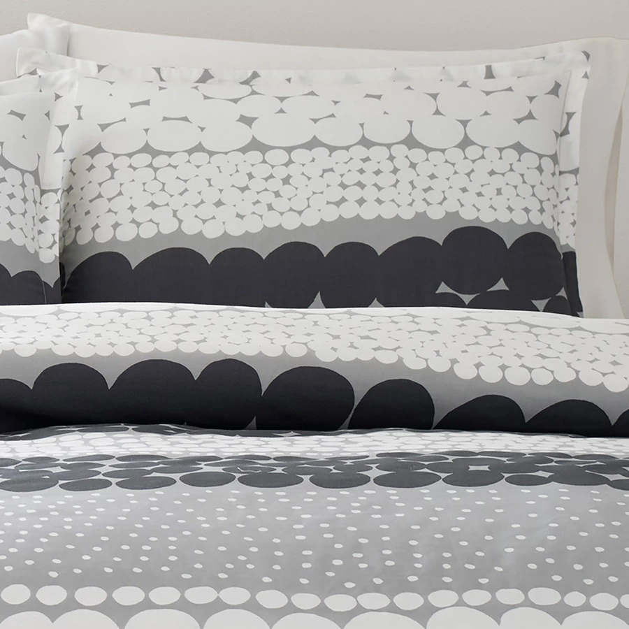Jurmo Dark Shadow by Marimekko bedding features a modern design in charcoal & grey tones. Charcoal, grey and white circle panels create a unique and interesting look. 100% percale cotton with a 200 thread count makes for a comfortable sleeping surface. Top of bed has a self-reverse. Breathe new life into your bedroom with a new bedding ensemble from Marimekko bedding. Machine washable.