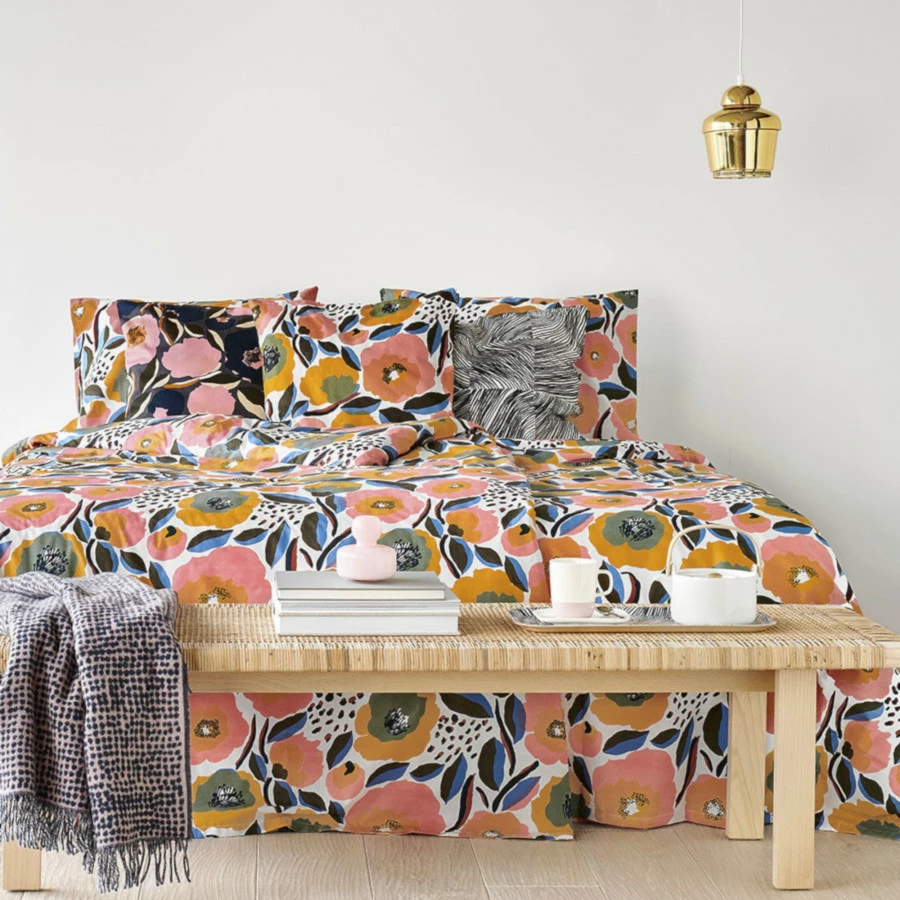 Inspired by the rugosa roses in the designer’s front garden, this painterly floral captures the poetic moment of fullest bloom when petals are just starting to fall as autumn winds begin. A warm palette of pink, coral, and golden orange is cooled with touches of green and blue on a crisp white cotton ground, creating a rich tapestry of saturated color.