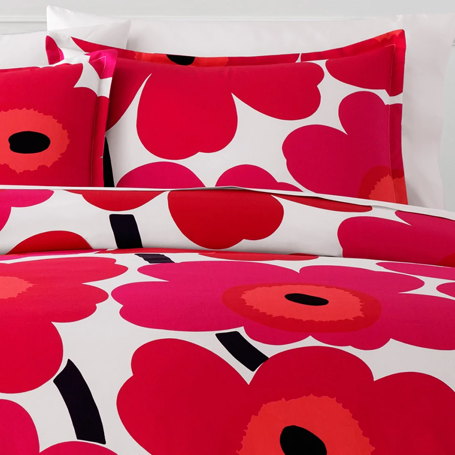 Unikko Red bedding by Marimekko features a large scale modern floral print. The red flowers contrast perfectly with the white ground and the touch of black ties the whole print together. Unikko is a truly beautiful design that screams style. Brighten up your room and take your decor to a new high with this 100% percale cotton bedding with a 200 thread count. Machine washable.