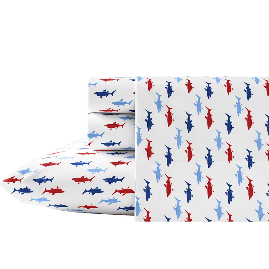 Nautica Costazul sheet set features a shark design in red, navy and light blue on a crisp white ground. Sheet set includes flat sheet, fitted sheet and pillow cases. 100% percale cotton woven sheets are soft and comfortable with a 200 thread count. Top of the line materials and construction means these sheets will last. Machine washable.