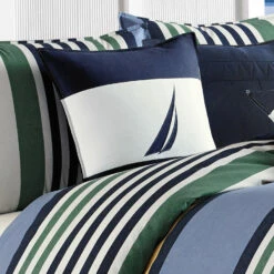 Nautica Dover Blue comforter and duvet sets are the perfect addition for your bedroom. The comforter and duvet feature a blue ground with white, blue, green and yellow horizontal stripes. Comforter reverses to solid navy. Comforter and sham designs are engineered. All pieces are 100% cotton for superior comfort and style. Breathe new life into your bedroom with a new bedding set from Nautica.
