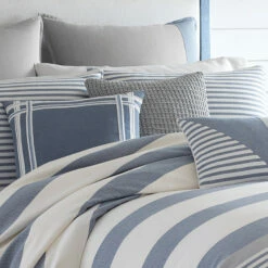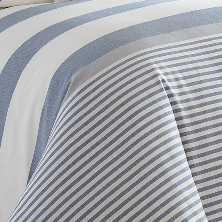 Fairwater Comforter and Duvet set by Nautica bedding feature a yarn-dye stripe design. Bold evenly spaced stripes run east-west on the comforter over an off-white ground. The yarn-dyed stripes are a soft, medium weight blue and white with an accent of gray at the bed break. On the reverse is solid grey. Wrap yourself in 100% cotton comfort for a perfect night of sleep. Machine washable.