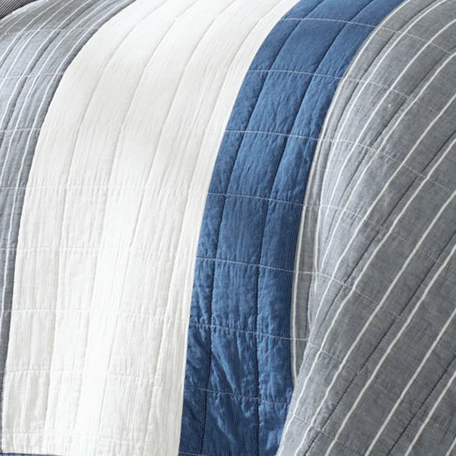 This Stylish Quilt Set Has A Modern Tailored Look That Will Fit Comfortably In Any Bedroom. Pieced With All Cotton Yarn Dye Solids In Deep Blue Chambray And White And A Yarn Dye Pinstripe In Gray And White, The Resulting Engineered Stripe Reflects A Classic Menswear Influence That Is Both Casual And Elegant In Its Simplicity. Pre-Washing Adds Extra Comfort And Softness. Channel Stitch Quilting Complements And Enhances The Design And Deep Blue Binding Edges The Quilt And Shams For A Clean, Tailored Finish.