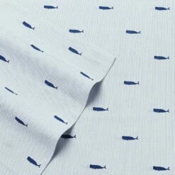 A Nod To The Nautical, Whale Stripe Cotton Percale Sheeting Features Charming, Classic Navy Maritime Whales Tossed On A Chambray Pinstripe