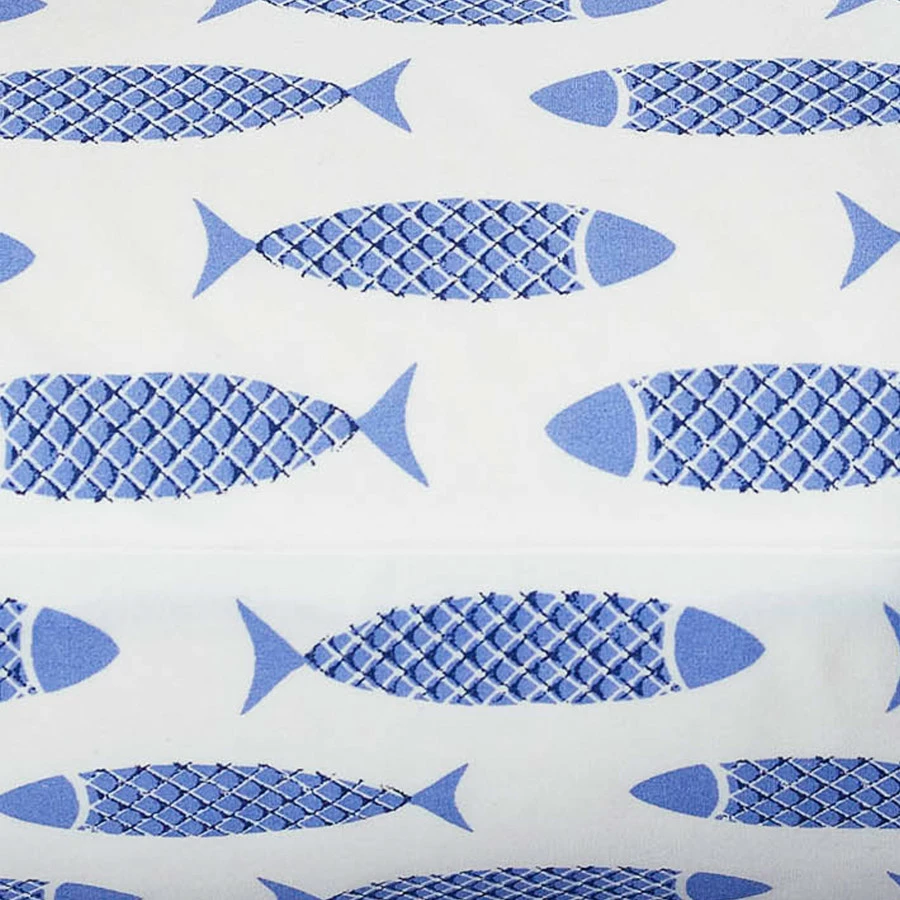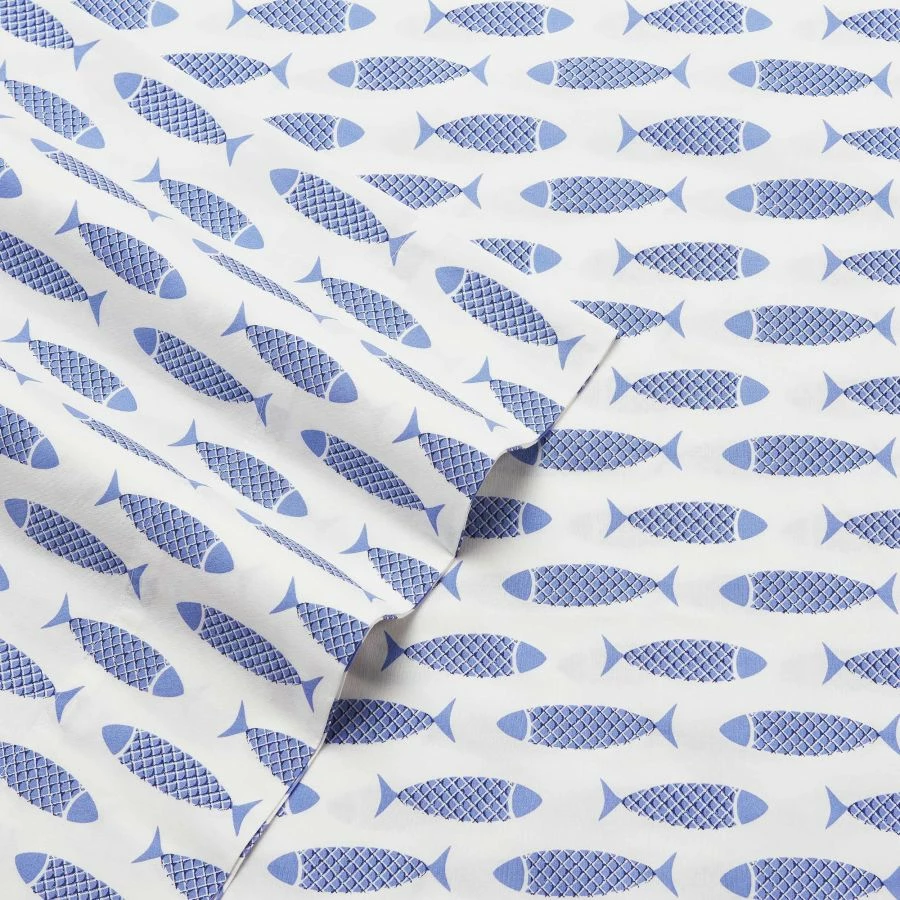 Features A Decorative Woodblock Fish Motif In Fresh Blues Against A Crisp White Ground. This Cotton Percale Sheeting Truly Inspires Coastal Living.