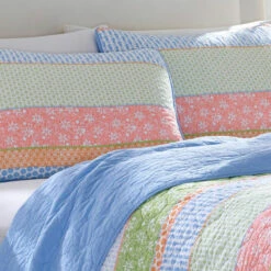 Poppy & Fritz Charlie quilt set offers a new take on classic patchwork quilts. Quilt features horizontal bands of mini print patterns in a fresh palette of pink, orange, lime, and chambray blue. Reverses to solid chambray blue which also trims the edges of the quilt and shams for a clean, tailored finish. 100% soft pre-washed cotton materials. Wrap yourself in a new Poppy & Fritz quilt set today. Machine washable.
