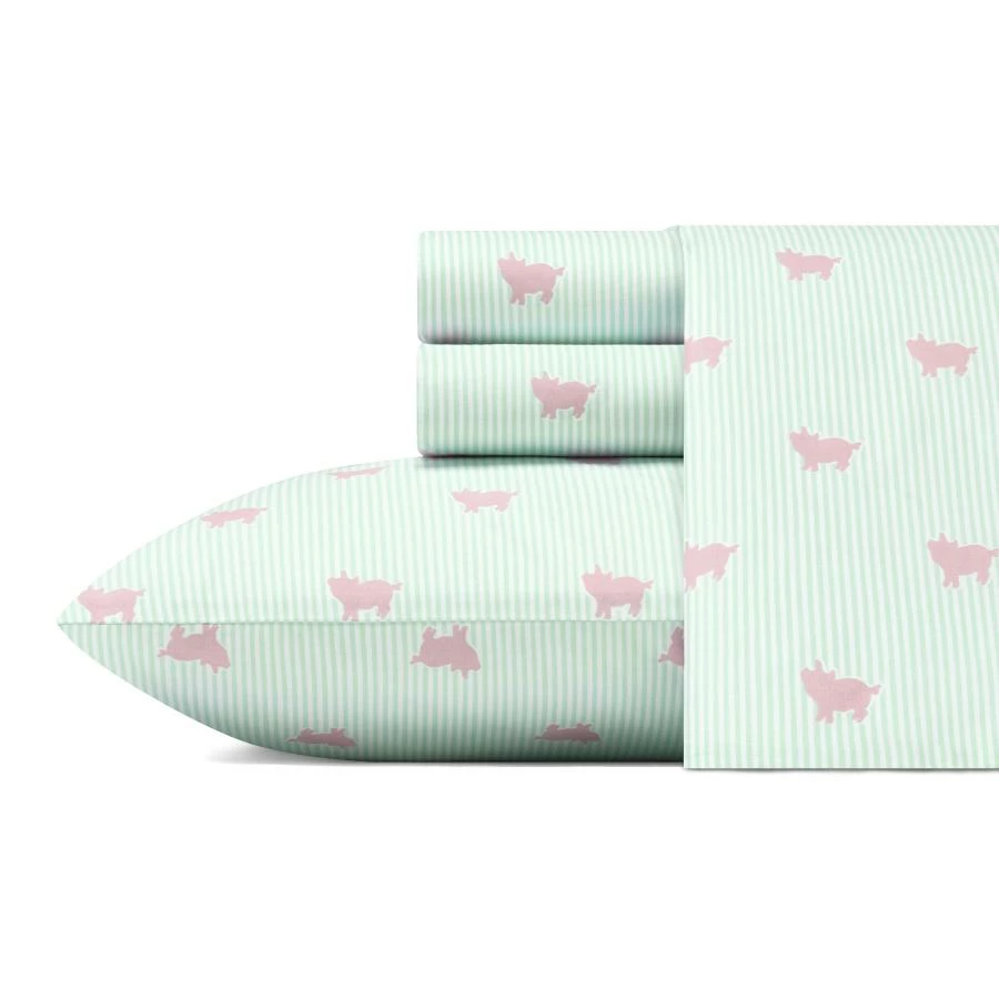 Dare To Be Different With ThePoppy and Fritz Pigs Sheet Set For An Unexpected And Unique Signature Touch To Your Bedding. These Whimsical Sheets Feature A Pink Pig Motif Scattered On A White And Green Striped Ground.