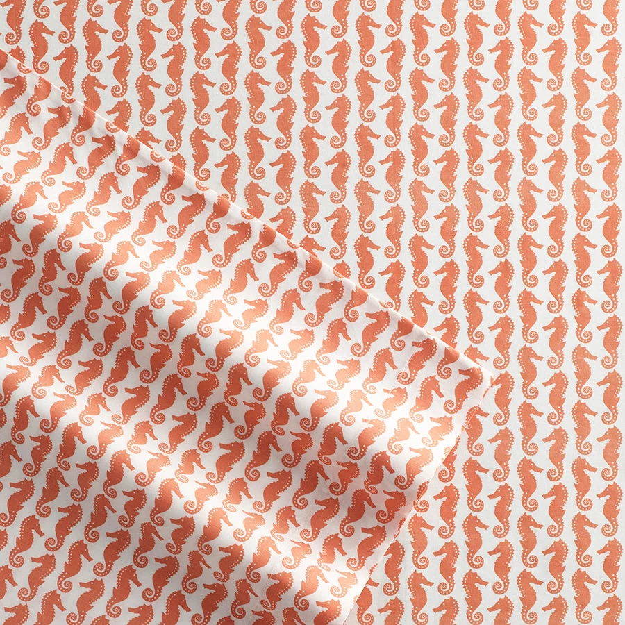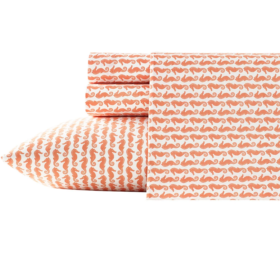 Poppy & Fritz Seahorses sheet set offers style plus comfort. The sheet set has a coral seahorse design on a white ground. Sheets are 100% percale cotton with a 200 thread count for superior softness. Combine with a new Poppy & Fritz bedding set or with your existing bedding. Let the comfort of the percale cotton ease you into a restful night’s sleep. Machine washable.