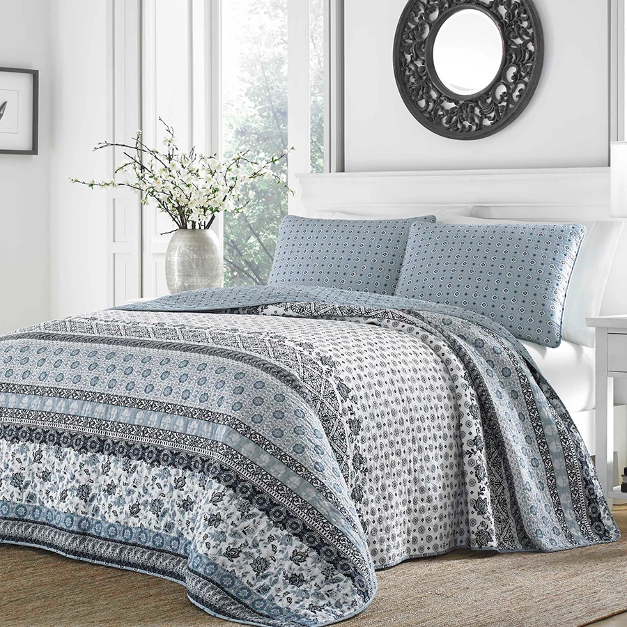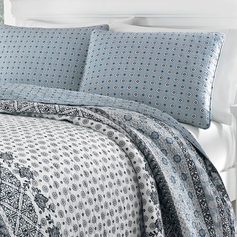 Bexley quilt set from Stone Cottage is a fresh take on a classic pattern which brings out your inner bohemian by incorporating warm neutral tones with interesting printed texture for a naturally relaxed look. This beautiful print incorporates a mix of provincial block prints arranged in a patchwork stripe layout along with a small-scale medallion foulard that is also used for the quilted shams and decorative binding for a clean, tailored edge. Machine washable.