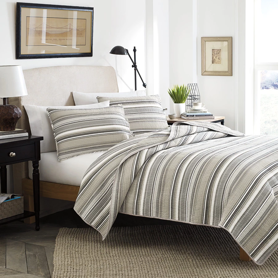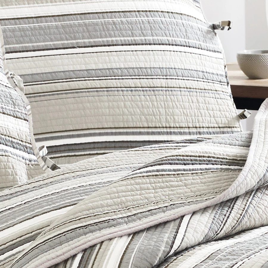 Stone Cottage Fresno Neutral quilt set features an east to west stripe design in neutral colors. Quilt reverse has a matching print to the quilt face. Bound edges in solid neutral beige. Coordinating tailored shams have two ribbon ties with a beige and white stripe. Stone Cottage uses high end fabrics for long lasting and soft bedding sets. Update your home with a new quilt set from Stone Cottage.