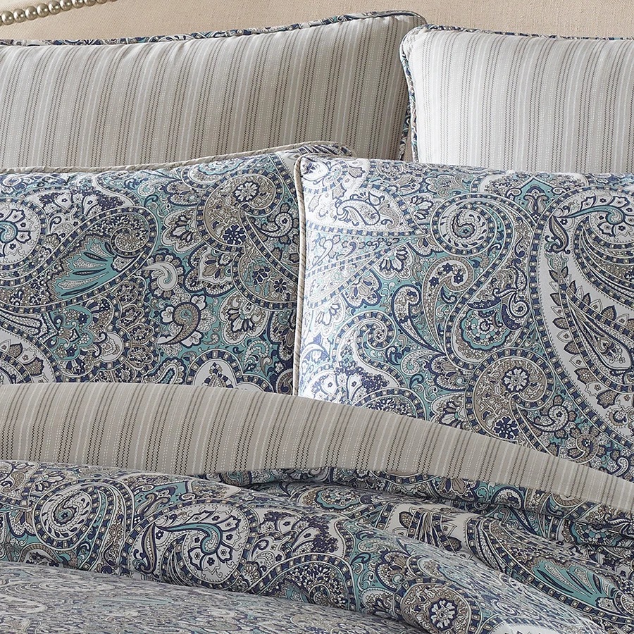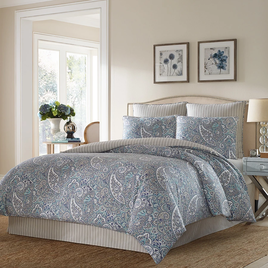 Lancaster comforter and duvet set is a bright new pattern from Stone Cottage bedding. Lancaster features an allover paisley design in tones of blue. The comforter reverse is solid tan with a small stripe print in brown and white. This intricate design will bring new life into your bedroom. Soft 100% sateen cotton materials provide a nice and comfortable sleeping surface. Machine washable.