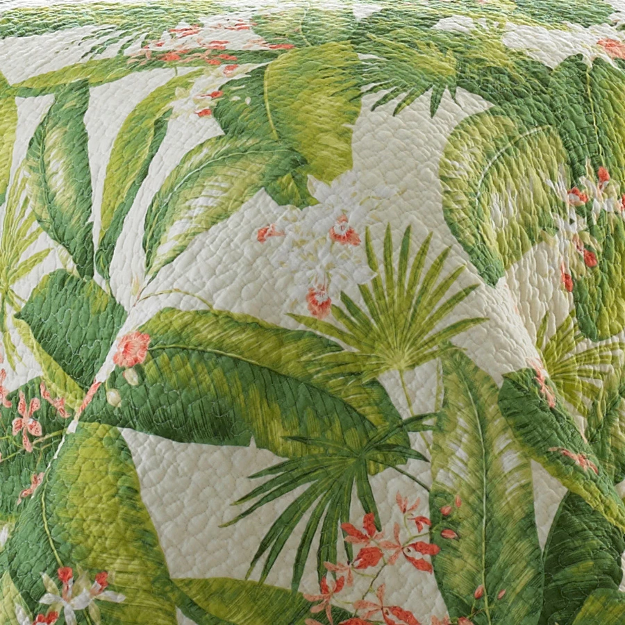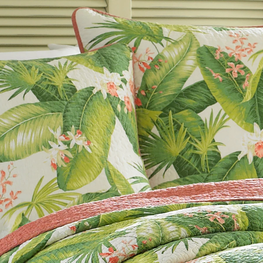 Argeada Dock ECRU quilt set by Tommy Bahama bedding features a large scale palm leaf print scattered over a white ground, with hints of pink flowers. On the reverse is a solid coral print with vermicelli stitching. Quilt and shams are prewashed for an extremely soft feel. 100% cotton with a cotton rich fill. Update your bedroom with a new Tommy Bahama quilt.