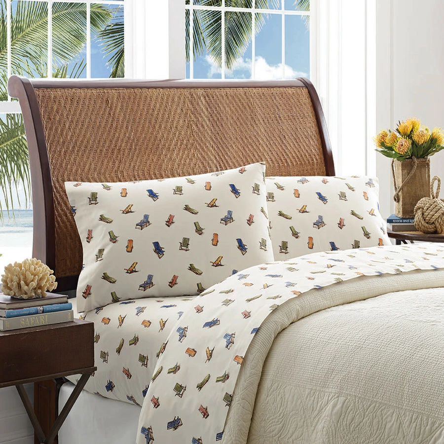 Beach chairs, pool chairs, deck chairs, and lounge chairs combine together in a lighthearted foulard design that will make you smile as you drift off to sleep remembering lazy days in the sun. Colorful cabana stripes on the individual chairs create a bright multicolor effect that can coordinate easily with many different bedding designs.