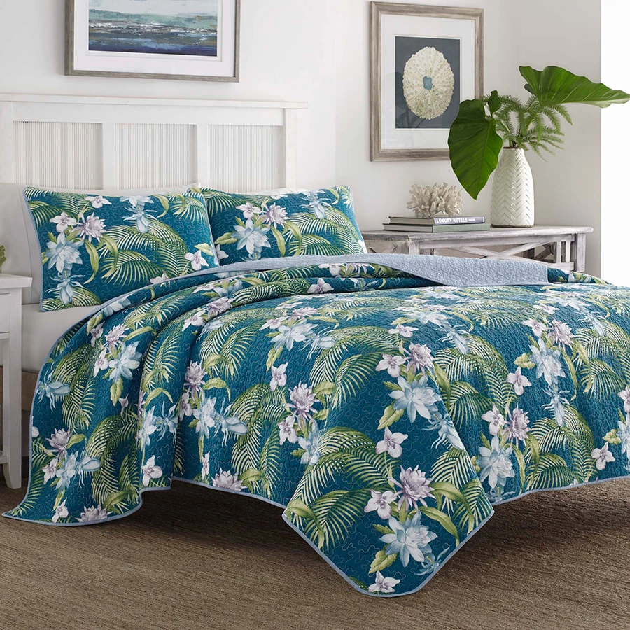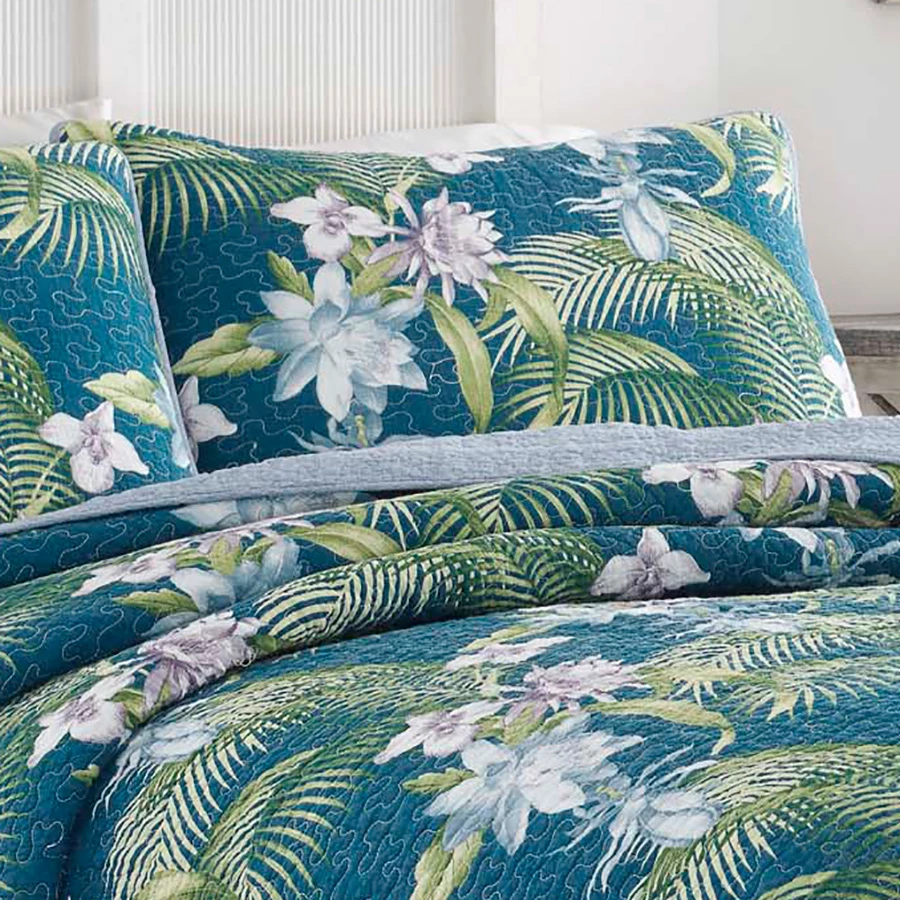 Southern Breeze quilt set by Tommy Bahama features a bold leaf design with exotic flowers. Quilt features tones of pale plum and chambray blue. Quilt and shams indigo blue ground gives way to the beautiful floral design. Quilt reverses to a weave texture print in chambray blue that also trims the edges of the quilt and shams. An allover vermicelli quilt stitch adds texture and additional comfort to this soft, pre-washed cotton quilt set. 100% cotton materials. Create a tropical escape within your bedroom by adding a new Tommy Bahama quilt set. Machine washable.