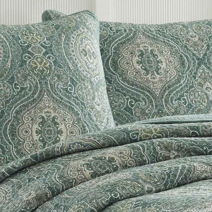 Turtle Cove quilt set by Tommy Bahama bedding features an all over damask design in green. On the reverse quilt and matching shams is a textured green print with vermicelli stitching. Quilt and shams are prewashed for an extremely soft feel. 100% cotton with a cotton rich fill. Update your bedroom with a new Tommy Bahama quilt.